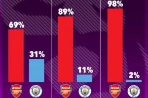 OPTA对三种赛果对争冠的影响进行了预测,若曼城赢球,阿森纳夺冠概率仍有69%,而若阿森纳赢球,夺冠概率将升至98%。